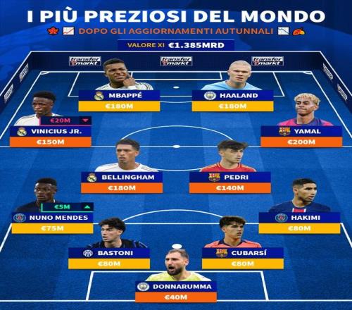 前锋:维尼修斯(皇马,1.5亿欧)、姆巴佩(皇马,1.8亿欧)、哈兰德(曼城,1.8亿欧)、亚马尔(巴萨,2亿欧)