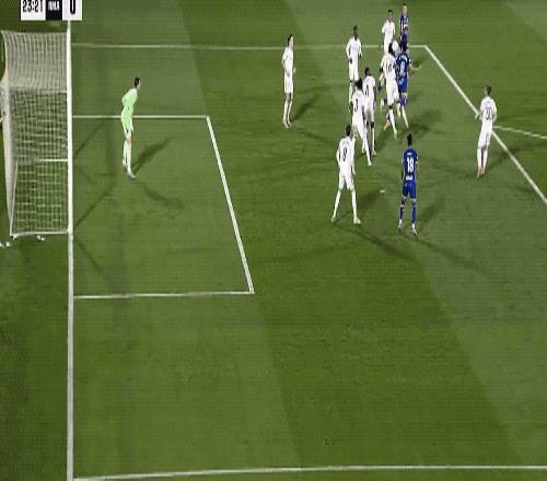 上半场补时阶段,皇马获得前场位置不错的任意球,久违的阿拉巴亲吻皮球,起脚射门,皮球的弧线相当诡异,门将注意力集中,将球扑出。